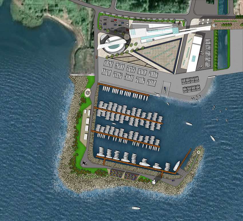 Площадь участка, расположенного за «Лахта Центром», - 4 га. Здесь планируется построить яхт-центр площадью 3,6 тыс. кв. м, бутик-отель и медиабашню. Для судов предусмотрены 50 мест для открытого хранения судов длиной от 15 до 20 метров, 50 мест – для судов длиной 10-15 метров, а также 100 мест для судов меньшей длины.